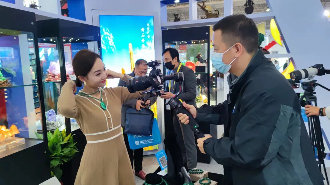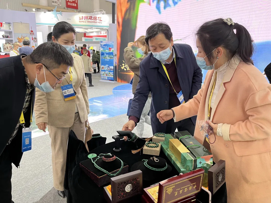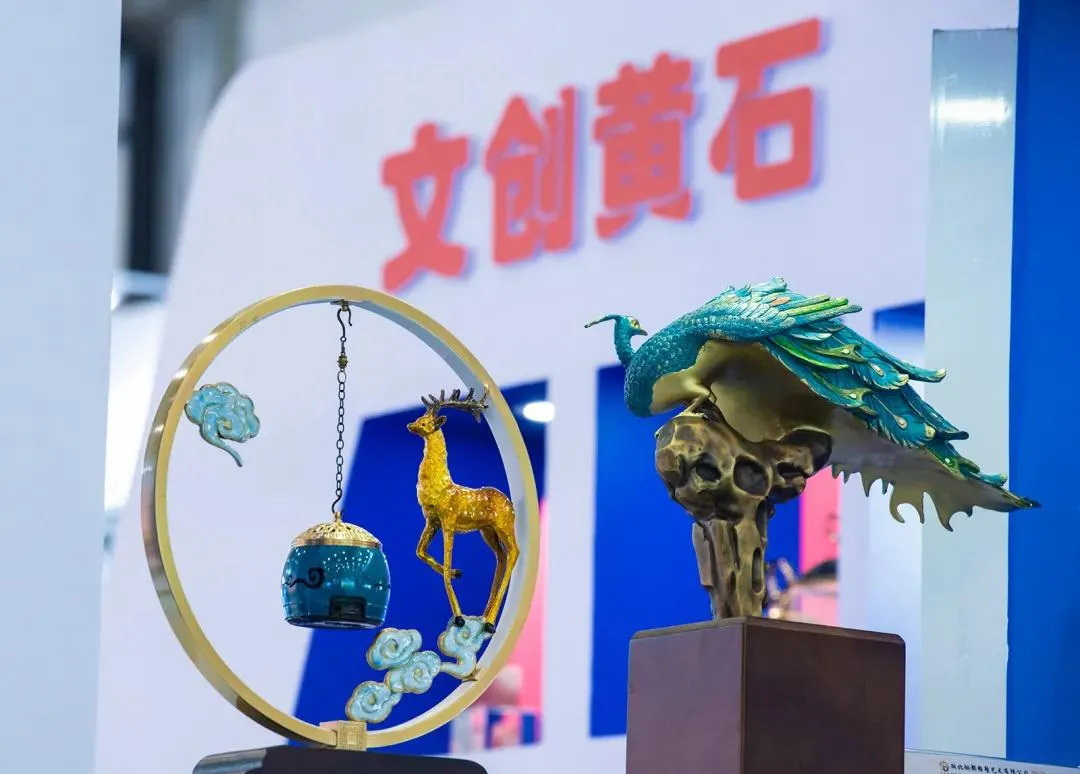 文博会现场,市文旅集团旗下的黄石文景公司展出的孔雀石礼品,将原生艺术品的矿冶文化文化元素与产品本身的创意相结合,形成孔雀石高端定制文化创意礼品——“黄石有礼”。在文博会现场璀璨夺目,博人眼球,获得了大家的喜爱,使游客朋友们爱不释手,纷纷前来拍照合影。